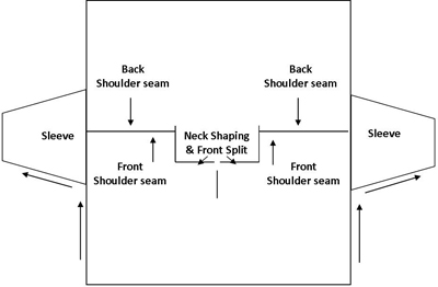 in half lengthways, place centre fold to shoulder seam, whip stitch sleeves into